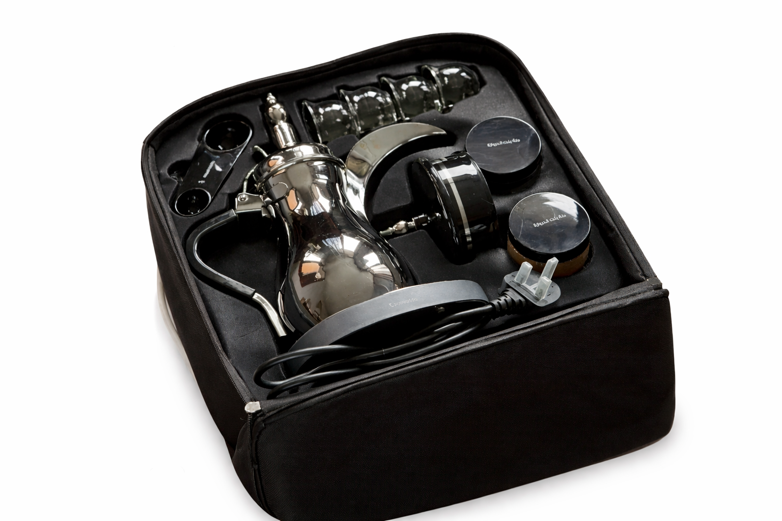 Designed for travelers, this model comes in a heavy-duty, organized carry bag that fits all your hospitality needs. The kit includes the electric Dallah, a power base, 4 coffee cups (Fingans), specialized containers for coffee, cardamom, and dates, and a precise measuring scoop. The built-in filter guarantees a smooth texture and easy maintenance after every brew.